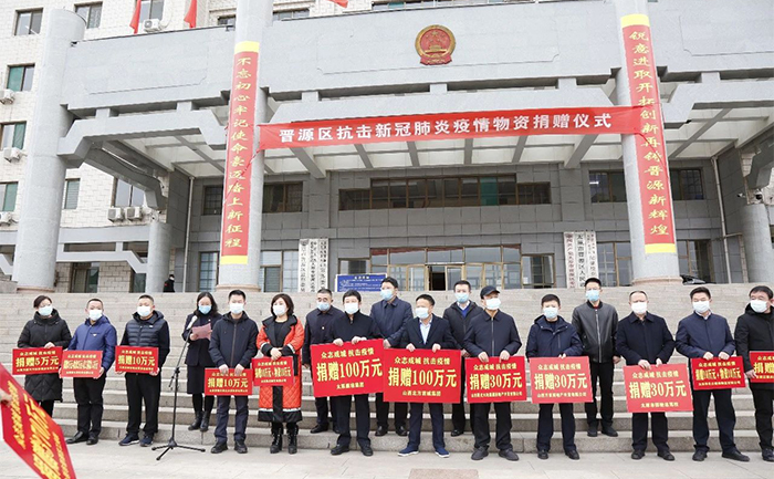 2月14日上午,在晉源區(qū)“獻愛心抗疫情捐贈儀式”上,集團董事長康偉代表康培集團在晉源區(qū)抗擊新冠肺炎疫情物資捐贈儀式上捐款100萬元、捐贈醫(yī)用口罩18000個。